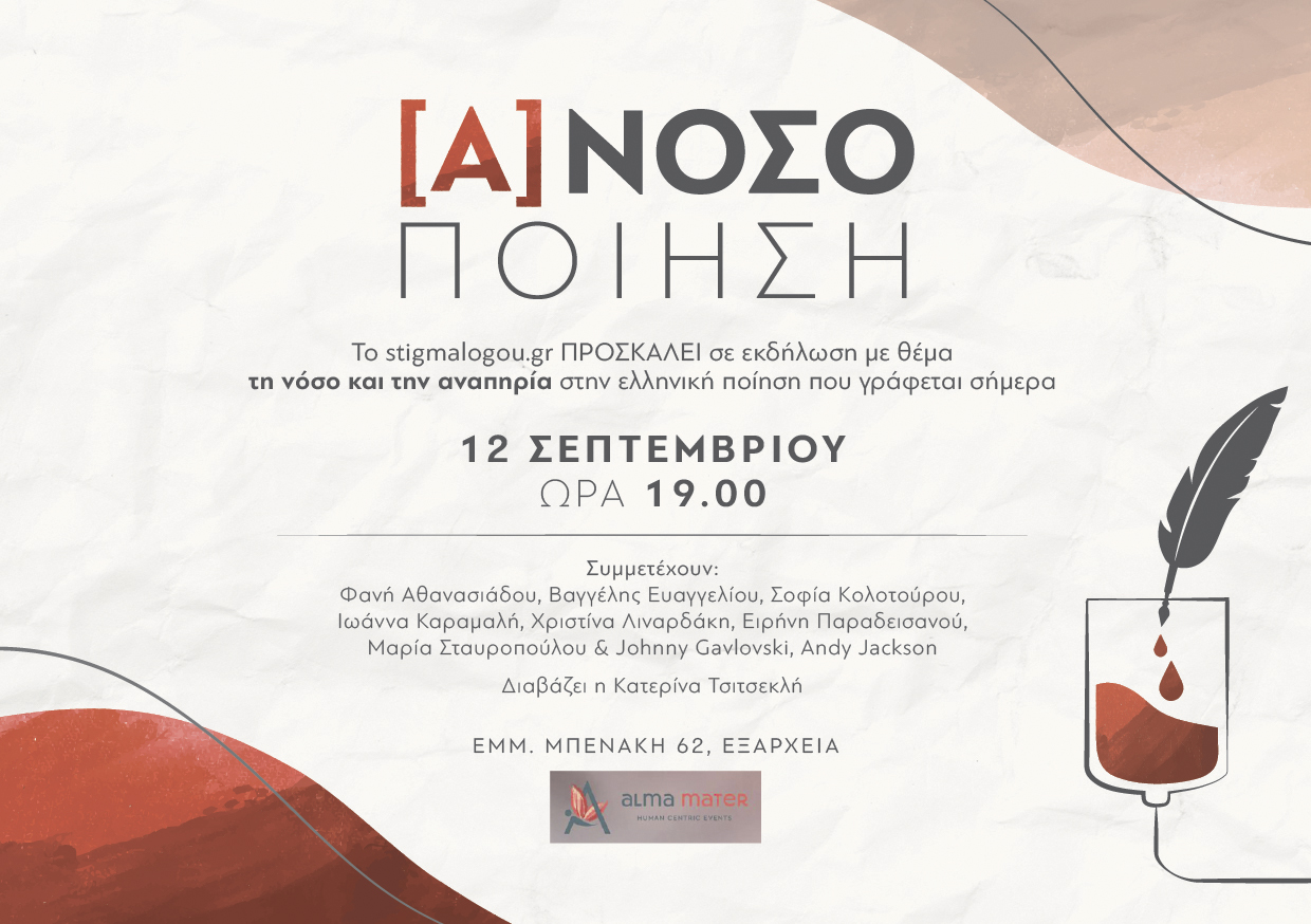 Εγκαινιάζουμε την [Α]νοσο/ποίηση, σειρά εκδηλώσεων και δράσεων που ελπίζουμε να συντελέσουν στην αύξηση της ενσυναίσθησης των συνανθρώπων μας όσον αφορά όσους ταλαιπωρούνται λόγω αναπηρίας ή χρόνιας/σοβαρής νόσου, σωματικής και ψυχικής, πολλές φορές απειλητικής για τη ζωή. Ελπίζουμε επίσης να χαρίσουν έναν χώρο έκφρασης σε όσους πάσχουν, έναν χώρο που μπορεί να λειτουργήσει απελευθερωτικά, παραμυθητικά, ακόμη και θεραπευτικά.