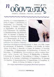 Ακολούθως, η οδοντωτός. Ο δεύτερος τόμος της, που εκτείνεται σε 420(!) σελίδες, έχει πλούσιο περιεχόμενο. Στην ενότητα «θεωρία», η Ευσταθία Δήμου γράφει για την πρόσφατη μεταφραστική της δουλειά, το Περί ύψους του Λογγίνου και για τον Ρεμπώ. Ο Γιώργος Γώτης συζητά στιγμιότυπα από τα ομηρικά έπη, ενώ ο Γιώργος Δελιόπουλος στοχάζεται πάνω στις σύγχρονες κριτικές αναγνώσεις. Τέλος, η Laura Espindola γράφει για τον πολιτικό ρόλο της ποίησης κατά Πλάτωνα και ο Διονύσης Στεργιούλας για το θαύμα του γραπτού λόγου. Στην ενότητα «μελέτη», συναντάμε μεταξύ άλλων κείμενα για τον Καβάφη και τον Σικελιανό, τον Χρήστο Μπράβο, την Αμαλία Τσακνιά, αλλά και τον William Blake.